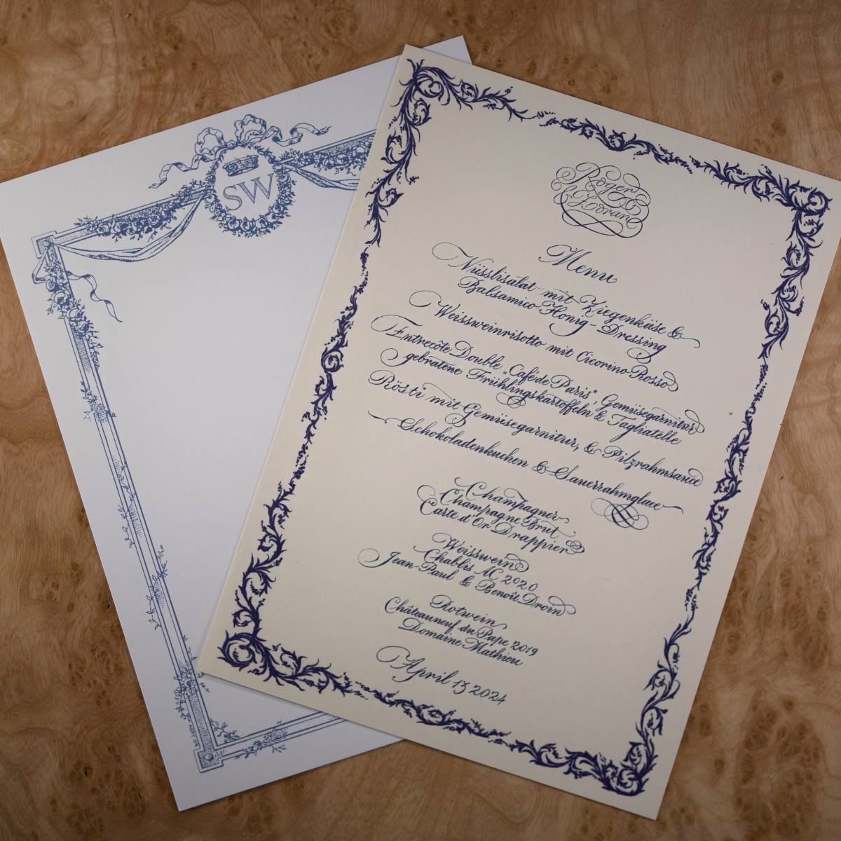 Nous proposons également un service de calligraphie pour les menus, chevalets et cartons de placement.